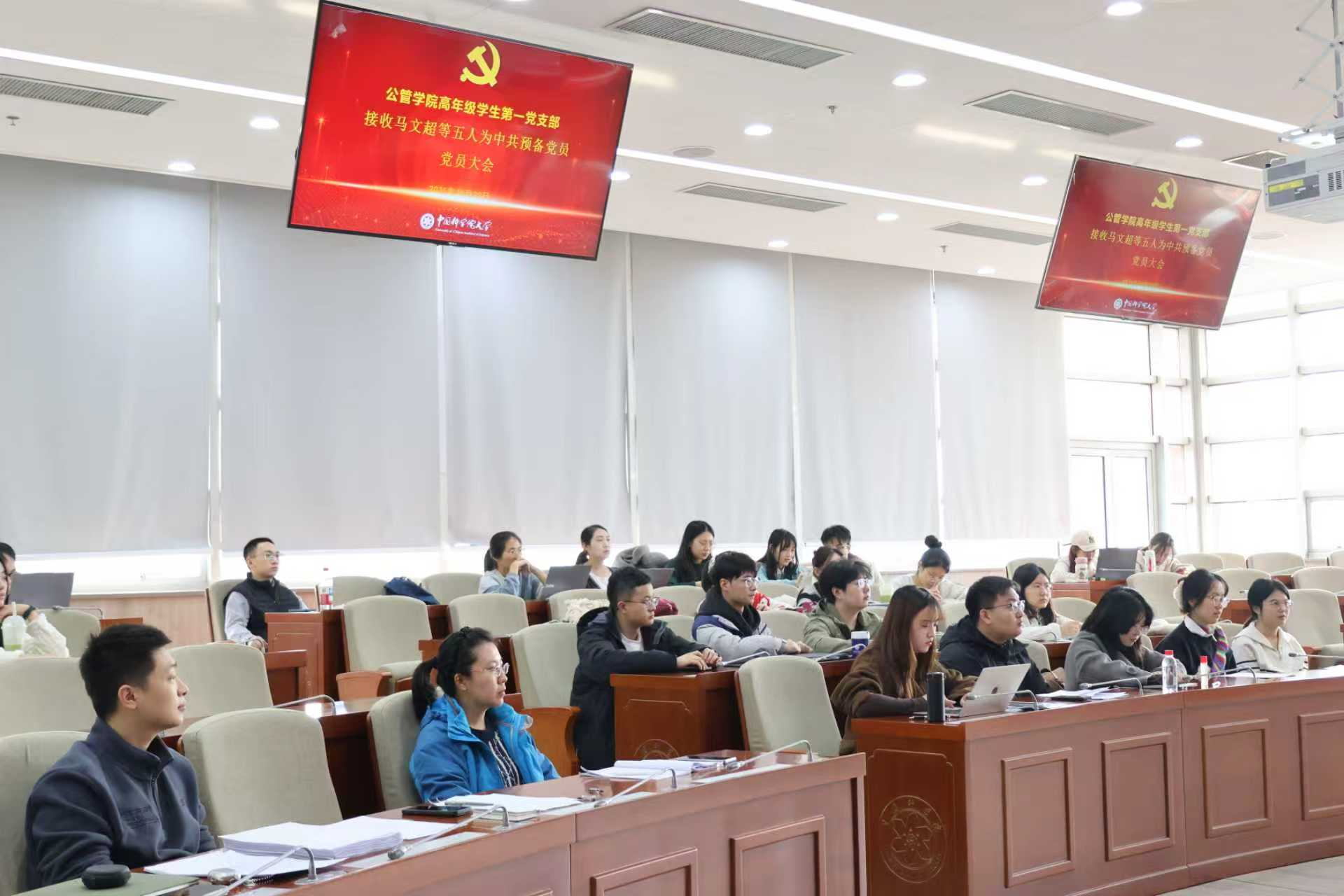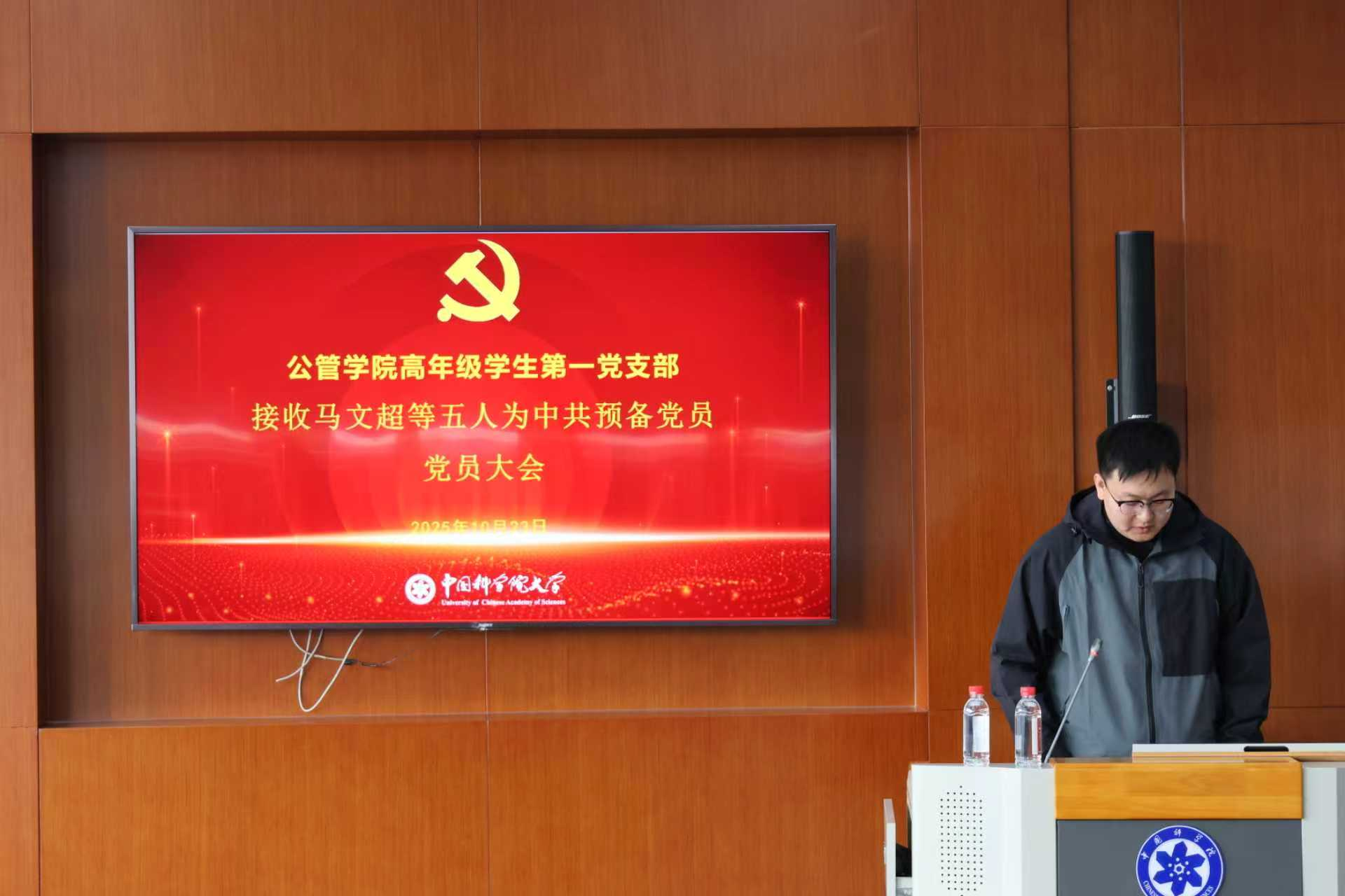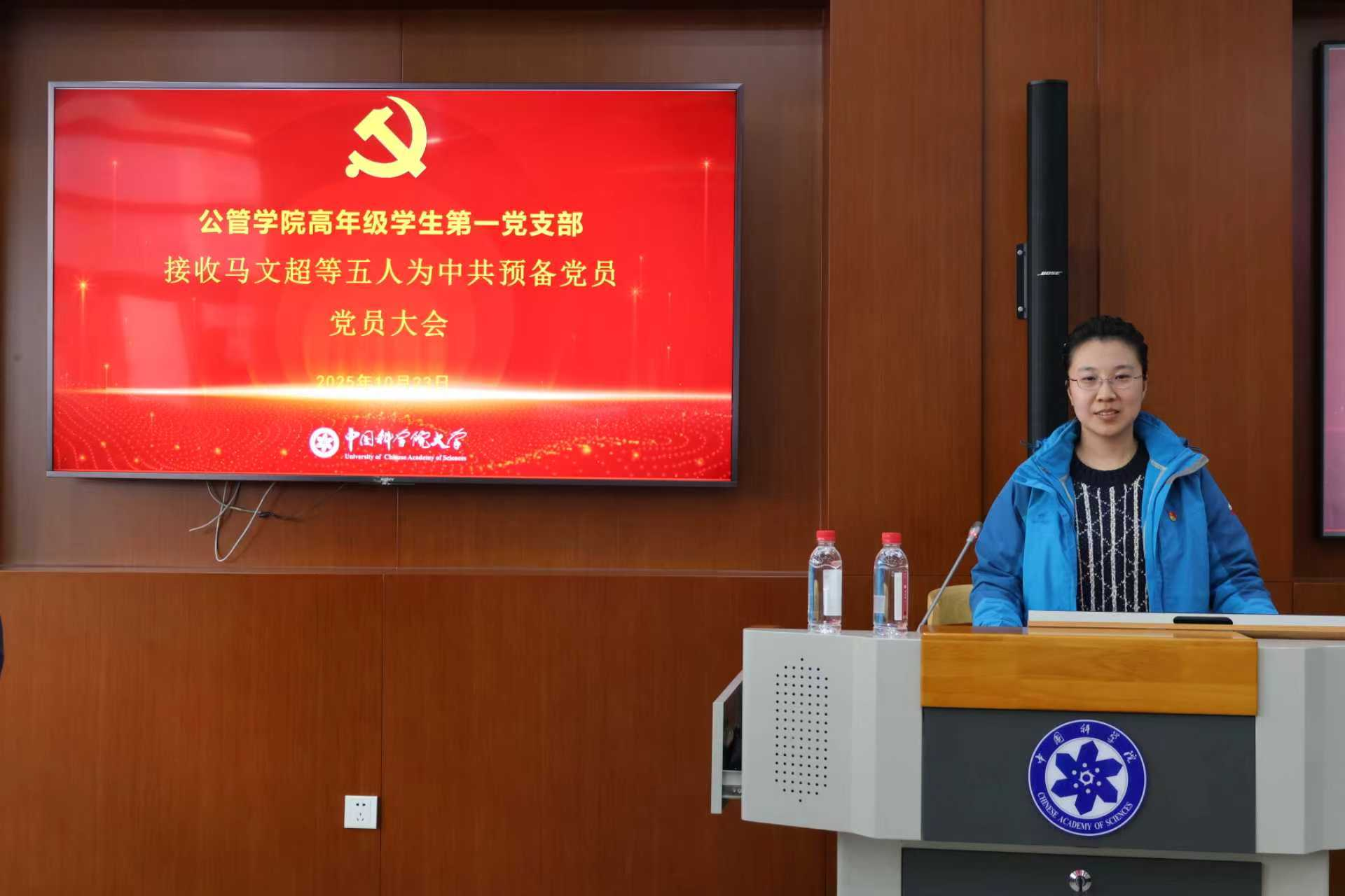 10月23日(周四)14:00,中国科学院大学公共政策与管理学院(以下简称“公管学院”)高年级学生第一党支部在中关村校区教学楼S406召开党员大会,讨论接收马文超、王千予、冯卓、成诗雨、高雪等五人为中共预备党员相关事宜。公管学院党总支委员殷宗萍出席会议,大会由公管学院高年级学生第一党支部书记李金潇主持。