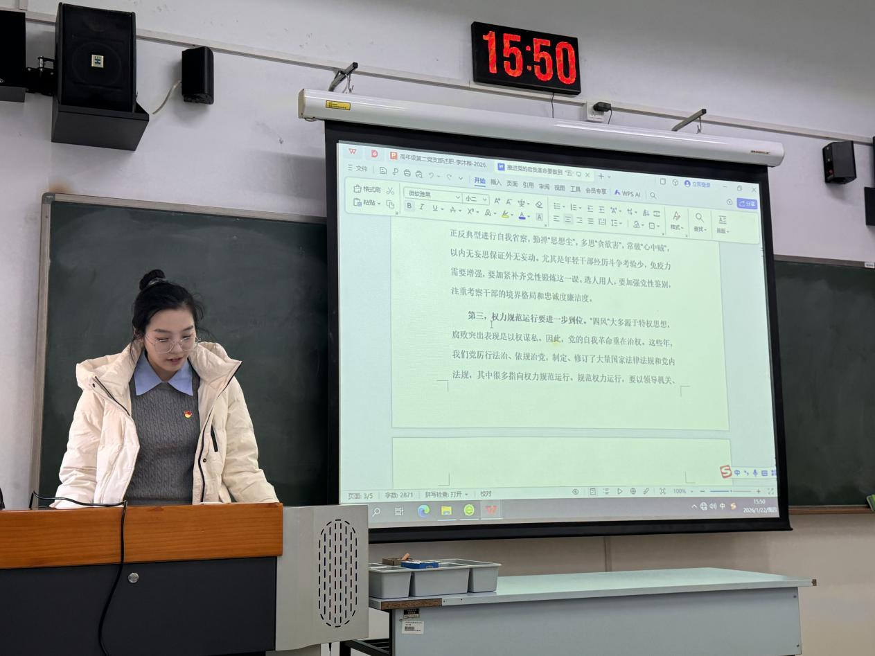会议首先集体学习了习近平总书记《推进党的自我革命要做到“五个进一步到位”》重要文章精神,深刻领会了党的自我革命的重大意义,明确了认识提升、党性增强、权力规范、监督执纪、责任落实“五个进一步到位”对生活学习的要求。随后,李沐桦对2025年度支部工作进行述职。她从突出政治引领、夯实组织基础、丰富实践载体三方面汇报了支部工作,在此基础上梳理了支部在工作流程熟悉度、长效机制建设、经验总结固化等方面存在的不足,并提出了今后的改进思路。