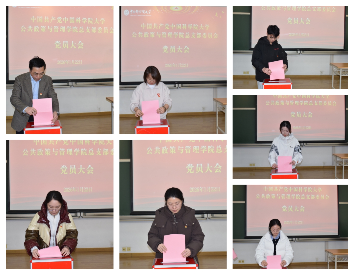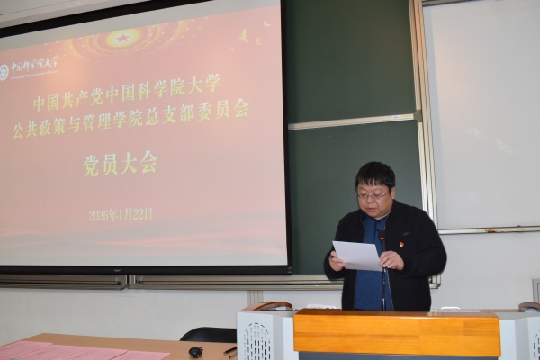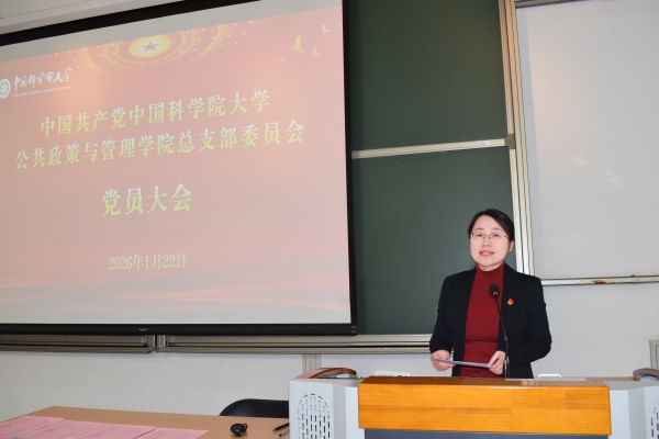 2026年1月22日下午,中国共产党中国科学院大学公共政策与管理学院总支部委员会(以下简称“公管学院党总支部”)全体党员大会在中关村校区召开,选举产生公管学院党总支部出席中共中国科学院大学第十一次党员代表大会代表。大会由公管学院党总支部书记邢丽主持。会议组织严谨、程序规范。