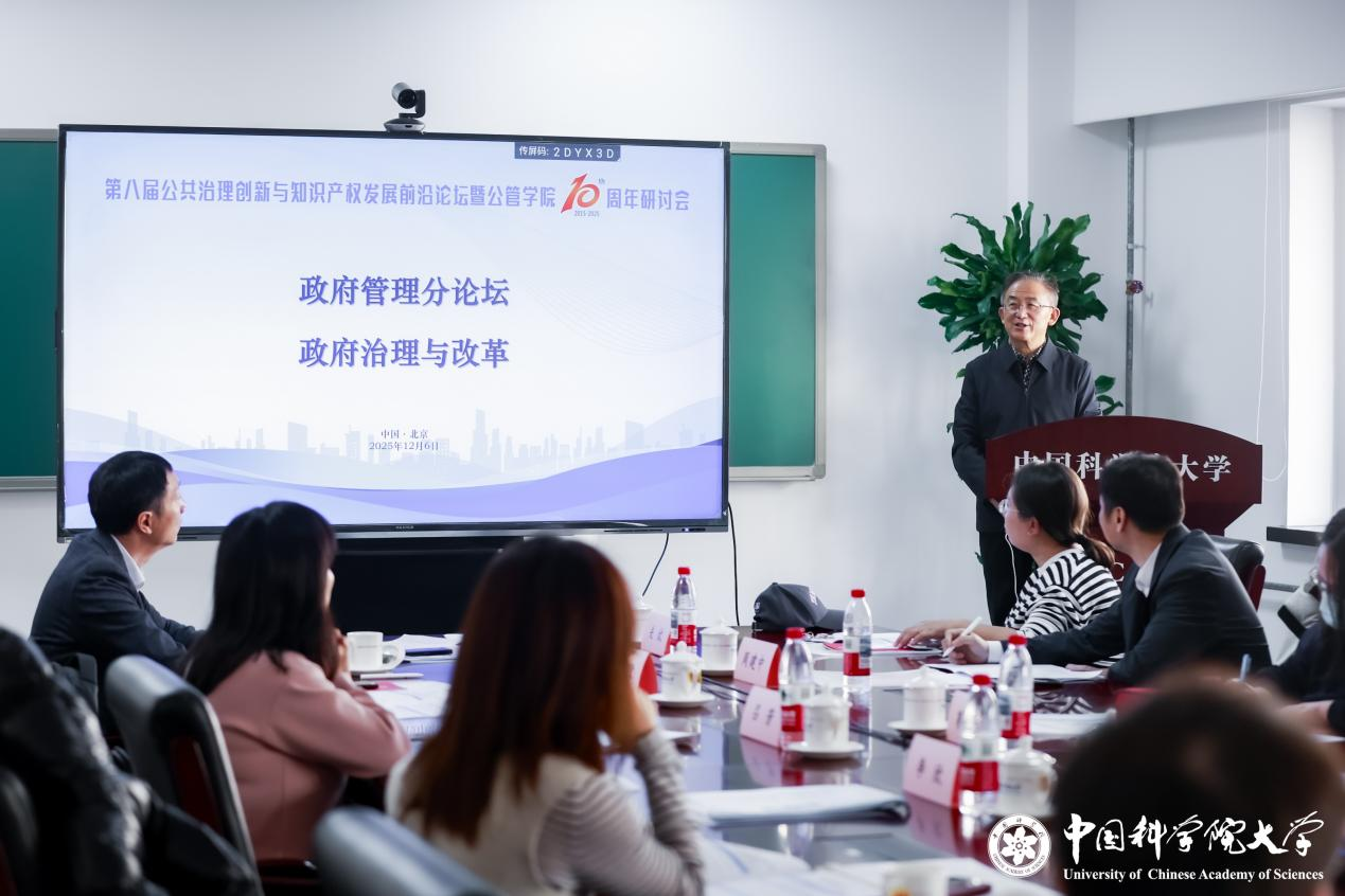 2025年12月6日,第八届公共治理创新与知识产权发展前沿论坛政府治理与改革分论坛在中国科学院大学青年公寓6号楼第二会议室准时召开。本次论坛由中国科学院大学公共政策与管理学院(以下简称公管学院)政府管理系主办,中国科学院科技战略咨询研究院(以下简称战略咨询院)研究员、政府管理系副主任周建中主持。