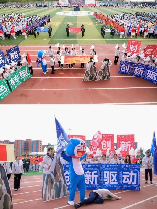 “资政英才献良策,经纶俊杰展宏图!”随着响亮的口号响彻运动场,方阵的创意表演将现场氛围推向高潮。马院长、邢书记手持金粉,在横幅上挥洒出公管学院的精神口号,金色粉末飘落的瞬间,场边掌声与欢呼声此起彼伏;紧接着,象征“发展难题”与“治理困境”的贝利亚玩偶,被代表“智库智慧”和“公管锦囊”的哆啦A梦玩偶“击败”。这场充满巧思的表演,将抽象的智库功能转化为直观生动的视觉语言,让全场观众深刻感受到公管学院“破解社会治理难题、服务国家发展大局”的使命担当。