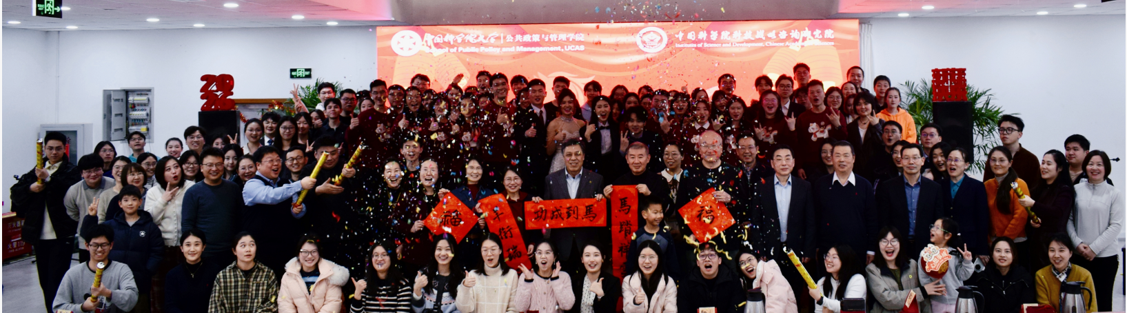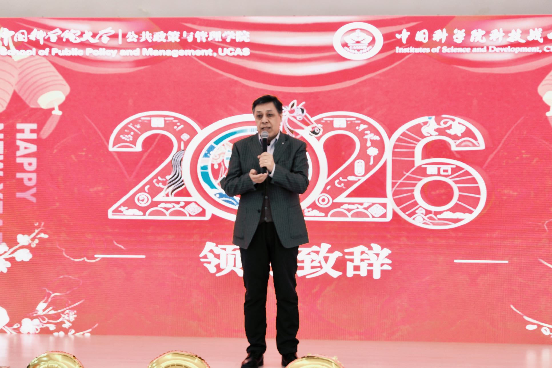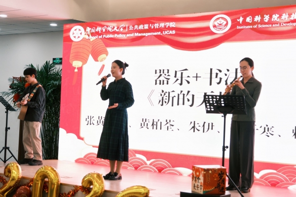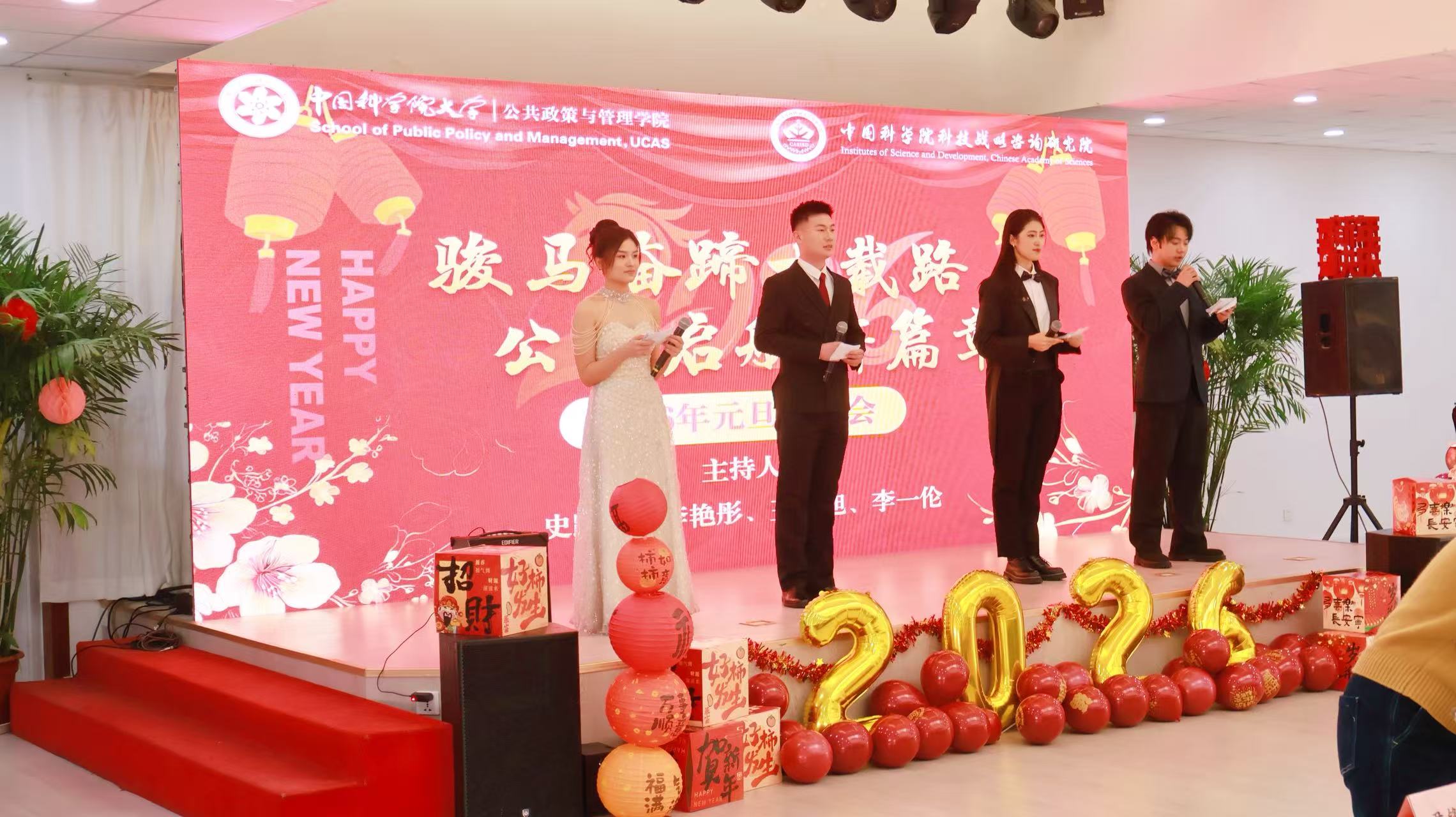 岁序更替,华章日新。12月28日,中国科学院大学公共政策与管理学院(以下简称公管学院)与中国科学院科技战略咨询研究院(以下简称战略咨询院)在中关村校区6号楼多功能厅隆重举办“骏马奋蹄十载路,公管启航新篇章”2026年元旦联欢会。公管学院院长、战略咨询院院长潘教峰出席并发表热情洋溢的新年致辞。知识产权学院院长、公管学院副院长马一德,公管学院党总支书记邢丽,战略咨询院院务委员、人事教育处处长李颖明,知识产权学院副院长阎文军、宋河发,战略咨询院研究生部主任吕秋培等公管学院和战略咨询院200余名师生欢聚一堂,共忆往昔硕果、共话未来愿景,在欢声笑语中辞旧迎新、共赴新程。联欢会由李艳彤、史路伟、王晨旭、李一伦四位同学倾情主持。